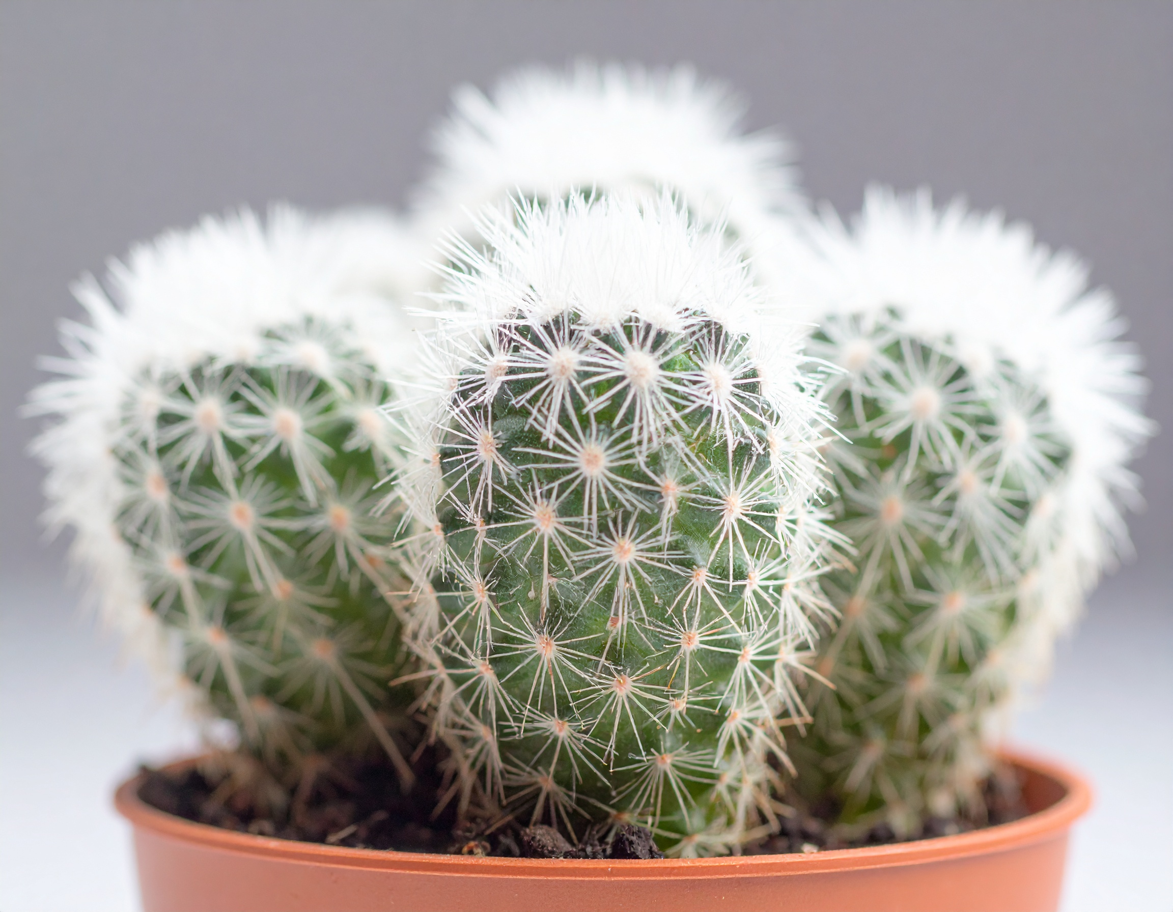 Uroczy, kulisty kaktus pokryty białymi włoskami. Tworzy efekt „śnieżnej kuli”. Często kwitnie małymi różowymi kwiatami.