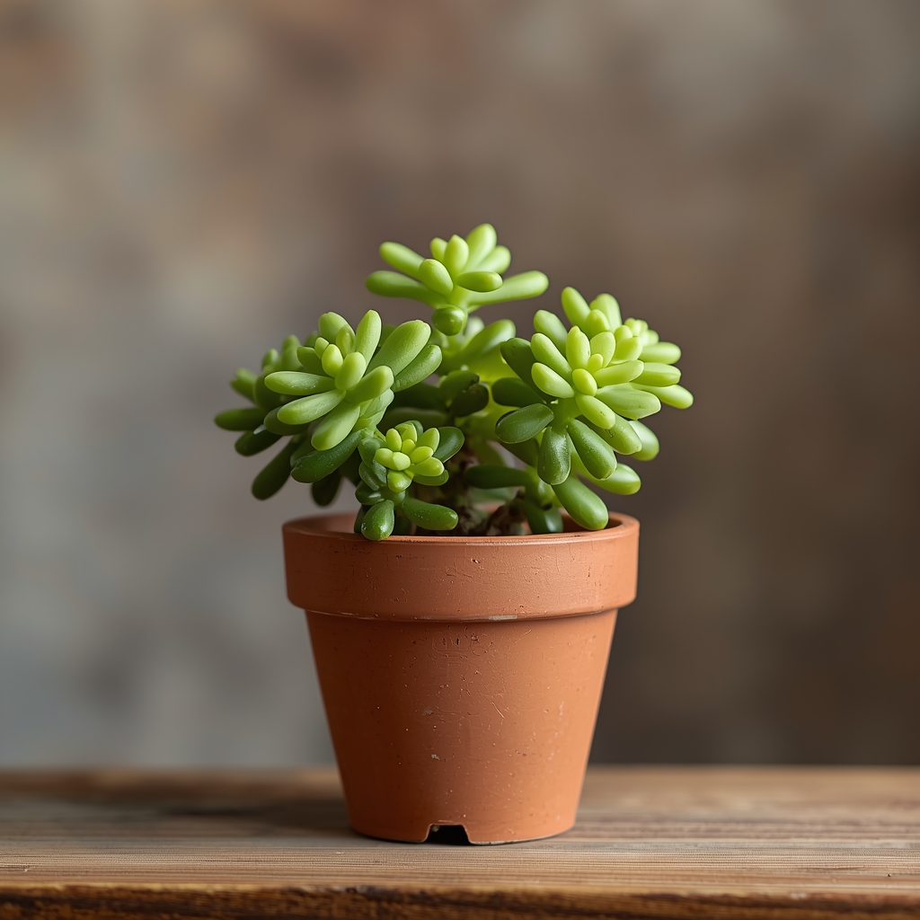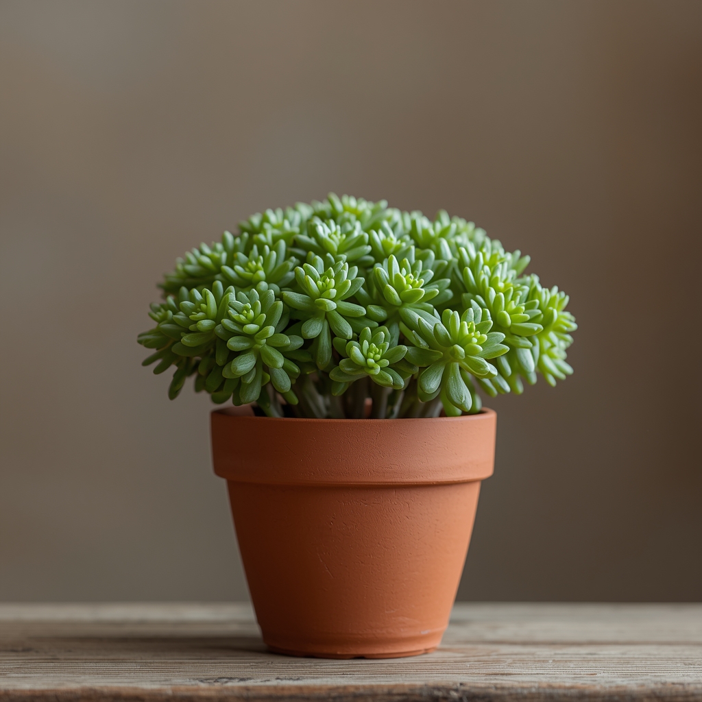 Zwisający sukulent o mięsistych, perłowych listkach. Idealny do wiszących doniczek.
